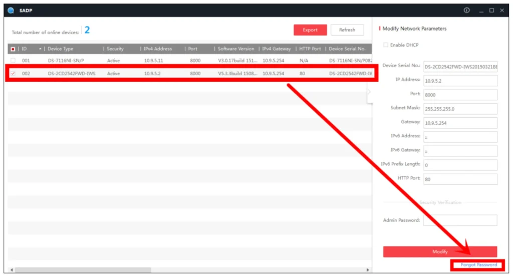 دستگاه را به Local Network (شبکه محلی) متصل کنید و ابزار SADP را برای جستجوی دستگاه های آنلاین باز کنید. دستگاه را انتخاب کنید و روی Forget Password کلیک کنید :