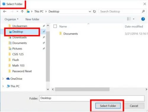پس از فشار دادن دکمه Export، پنجره Select Folder جدید ظاهر می شود. برای سهولت استفاده، Desktop را انتخاب کنید و روی دکمه Select Folder در پایین کلیک کنید.